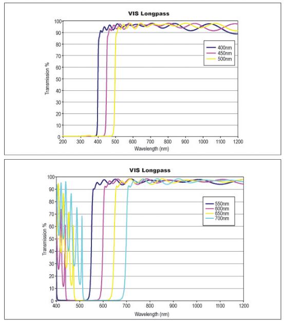 Longpass filters are designed to have a sharp transition from reflection to transmission, making them ideal for various applications. Available in a variety of cut-on wavelengths, these filters are designed for fluorescence,order sorting applications, and Display. Eliminate stray light by creating custom bandpass filters when combined with shortpass filters . A single layer AR coating on the back surface enhances the overall efficiency of each filter.